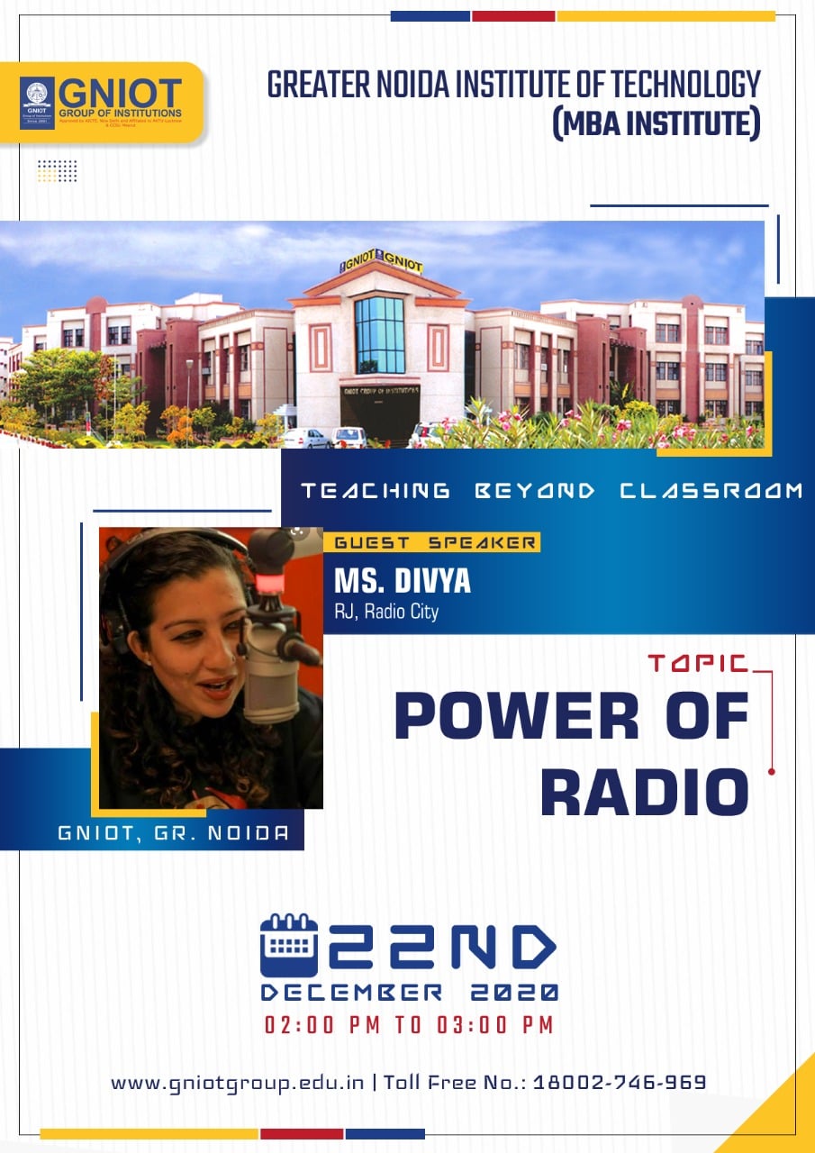 Greater Noida Institute of Technology - MBA Institute is coordinating a webinar on “Power Of Radio” with Ms. Divya, RJ at Radio City on 22 December 2020 from 2:00pm -3:00pm. Ms Divya will talk about radio as a mass medium that can be harnessed to enhance an education campaign since it can span great distances and reach a large number of listeners. Because of its wide coverage, relatively low unit cost, ability to reach those who are illiterate and without the use of mains power, it has proved to be an effective educational medium. The fact that it is non‐visual can be channeled to improve education quality since the listener is restrained to support the sound message by using his/her own imagination. No other medium has this educational power of stimulating and developing the abstract thinking of its audience and enriching and activating the listener's imagination.