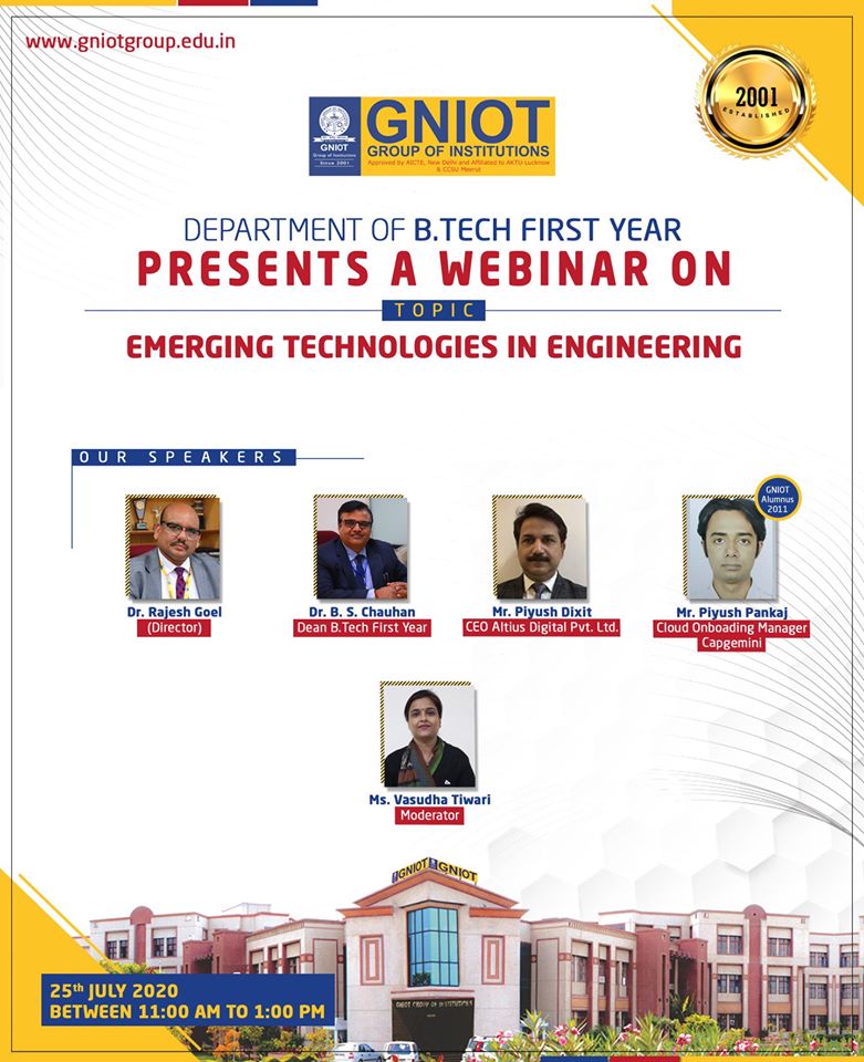 The Department of B.Tech.First Year, GNIOT, Greater Noida is organising a webinar on “Emerging Technologies in Engineering” on Saturday, 25 July, 2020 from 11:00 am to 1:00 pm.