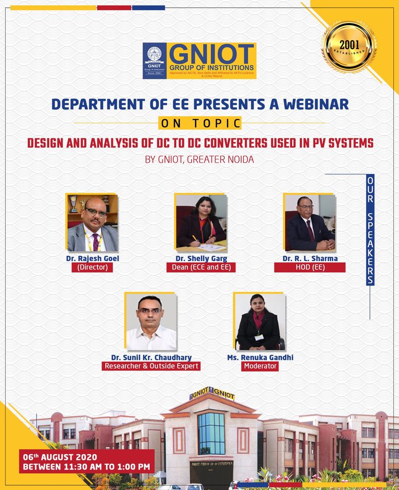 Department of Electrical Engineering, GNIOT GROUP OF INSTITUTIONS, GREATER NOIDA, is organizing a webinar on “Design and analysis of DC to DC Converters used in PV systems” on 6th Aug, 2020 between 11:30 AM to 01:00 PM.