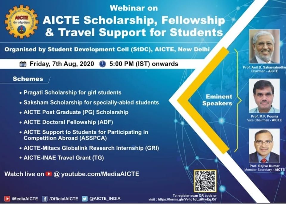 A plethora of schemes are being run by AICTE for the all-round development of students studying in AICTE approved institutions along with various schemes. To disseminate information about such schemes dedicated to students only, it has been planned by AICTE to organize a webinar on 7th August, 2020 at 17:00 hrs wherein the Hon'ble Chairman, Vice-Chairman and Member Secretary, AICTE will speak about the schemes and interact with the students.