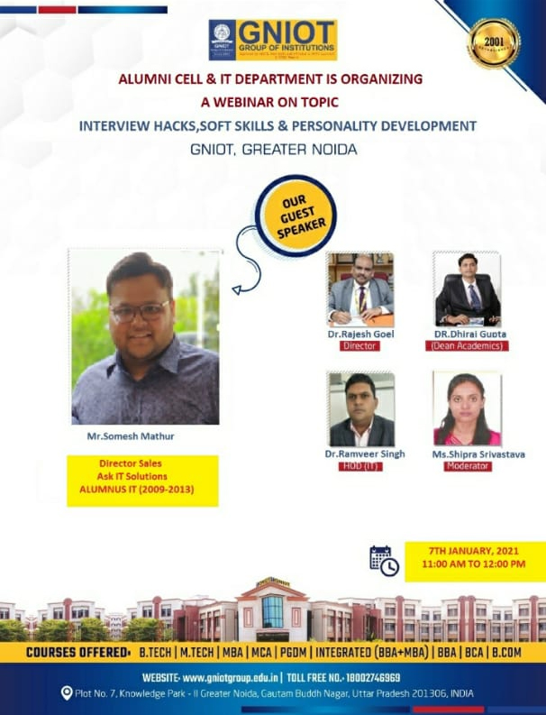 Alumni Cell and Department of Information Technology is jointly organizing a webinar on the topic "Interview Hacks, Soft skills and Personality development" on 7th January, 2021 from 11:00 am To 12:00 PM. The speaker of the Webinar Mr. Somesh Narain Mathur (Alumnus IT 2009-13) is currently working as Director Sales in Ask IT Solutions. In the said webinar Mr. Mathur will brief about tips to be followed during interviews along with importance of Soft Skills because soft skills are very important as they enable students to adjust to the frustrations and challenges they will encounter in their adult life, as well as the demands of work. Mastering soft skills help students learn, live and work better.