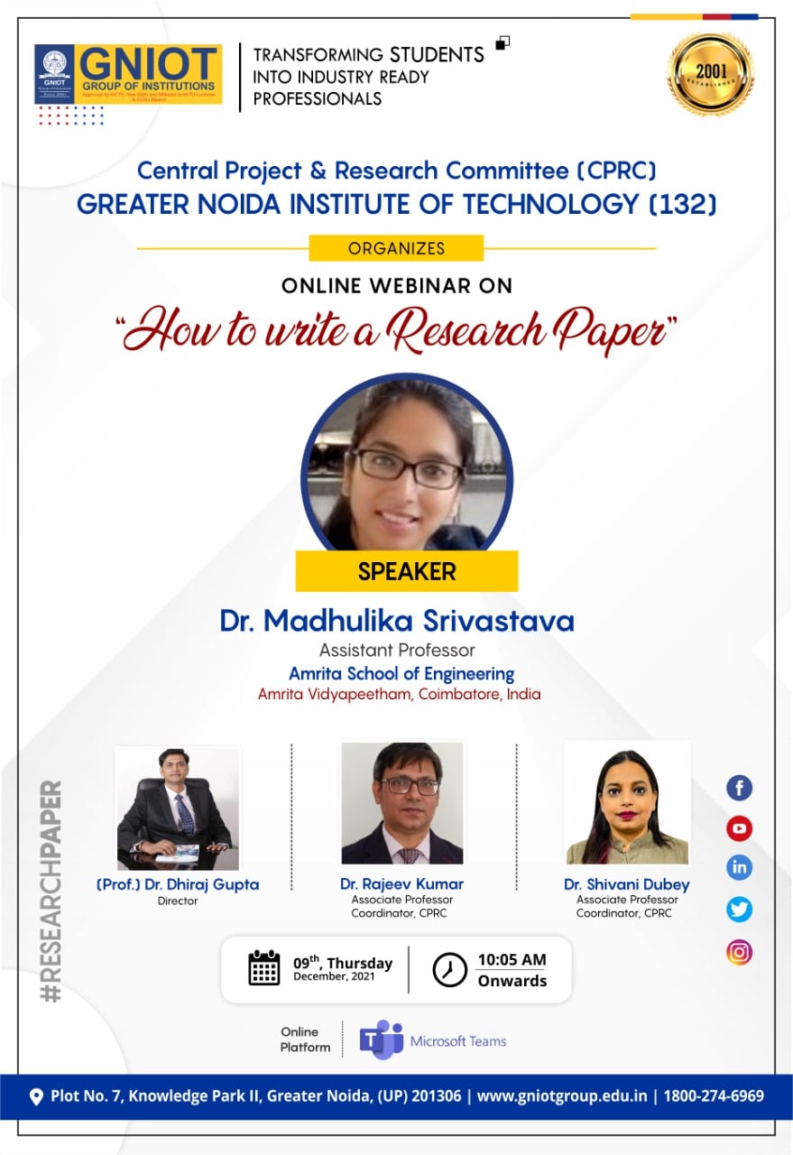 Central Project & Research Committee (CPRC), GNIOT (132) is organizing an online Webinar on How to write a research paper on Thursday 9 December, 2021 at 10:05 onwards. The key speaker is Dr. Madhulika Srivastava, Assistant professor, Amrita Vidyapeetham, Coimbatore, India. This online webinar is organising for all the students of B.Tech, M.Tech and MCA ( II, III, IV year) respectively.