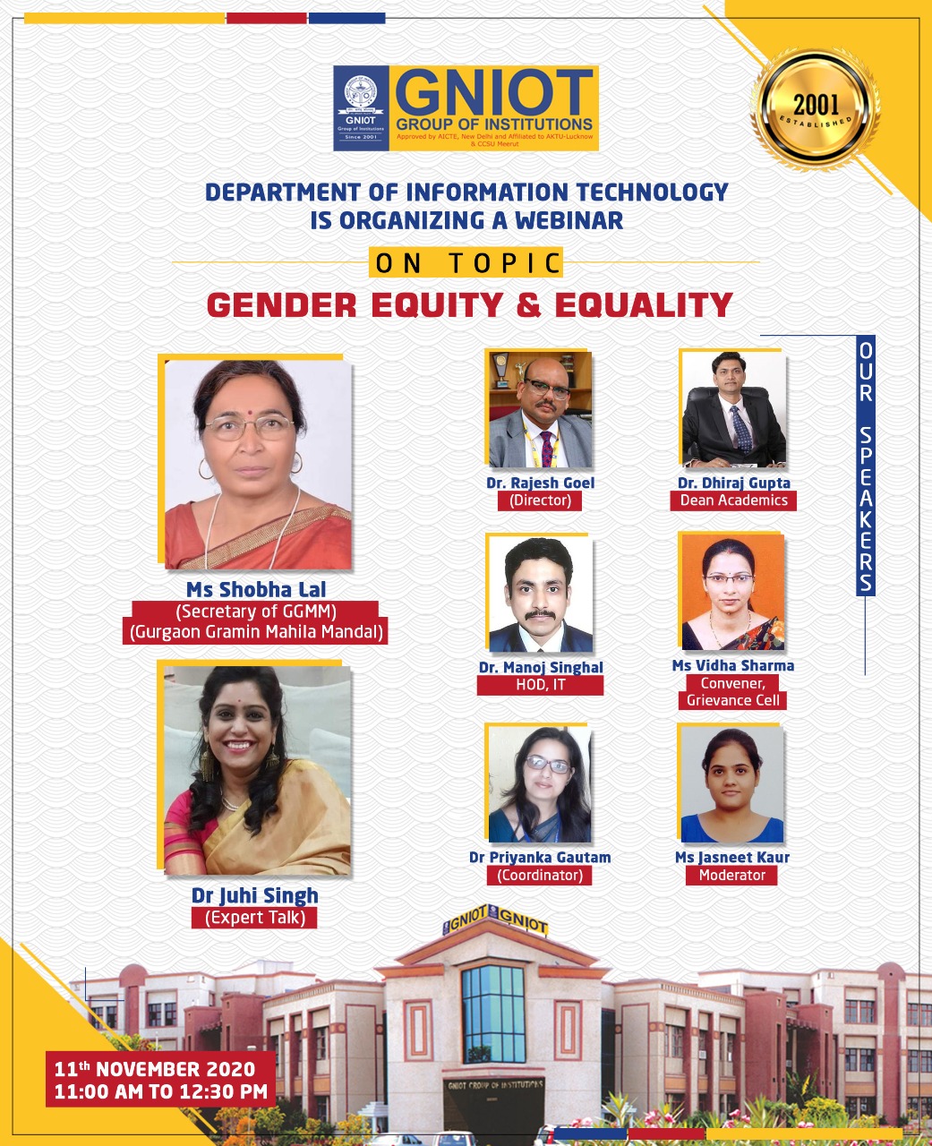 Date of Webinar 11 November 2020 Department of Information Technology, GNIOT Group of Institution, Greater Noida has conducted a webinar on ‘Gender Equity & Equality”.
