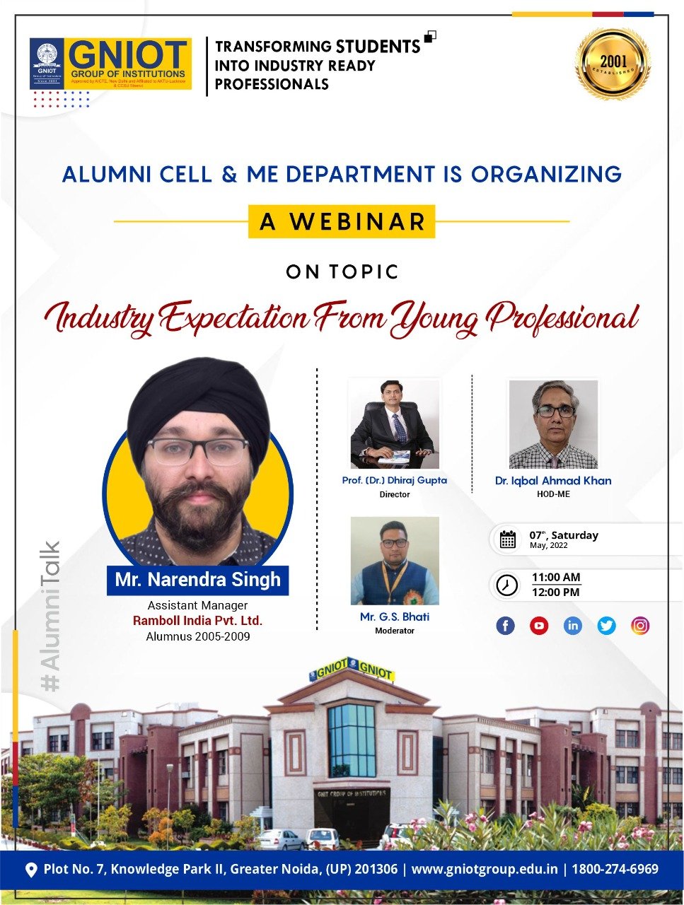 *Mr. Narendra Singh, an alumnus of GNIOT (pass out Batch of 2009) will be speaker of the event. You are all cordially invited to join the webinar on *07/05/2022, from 11:00am to 12:00pm