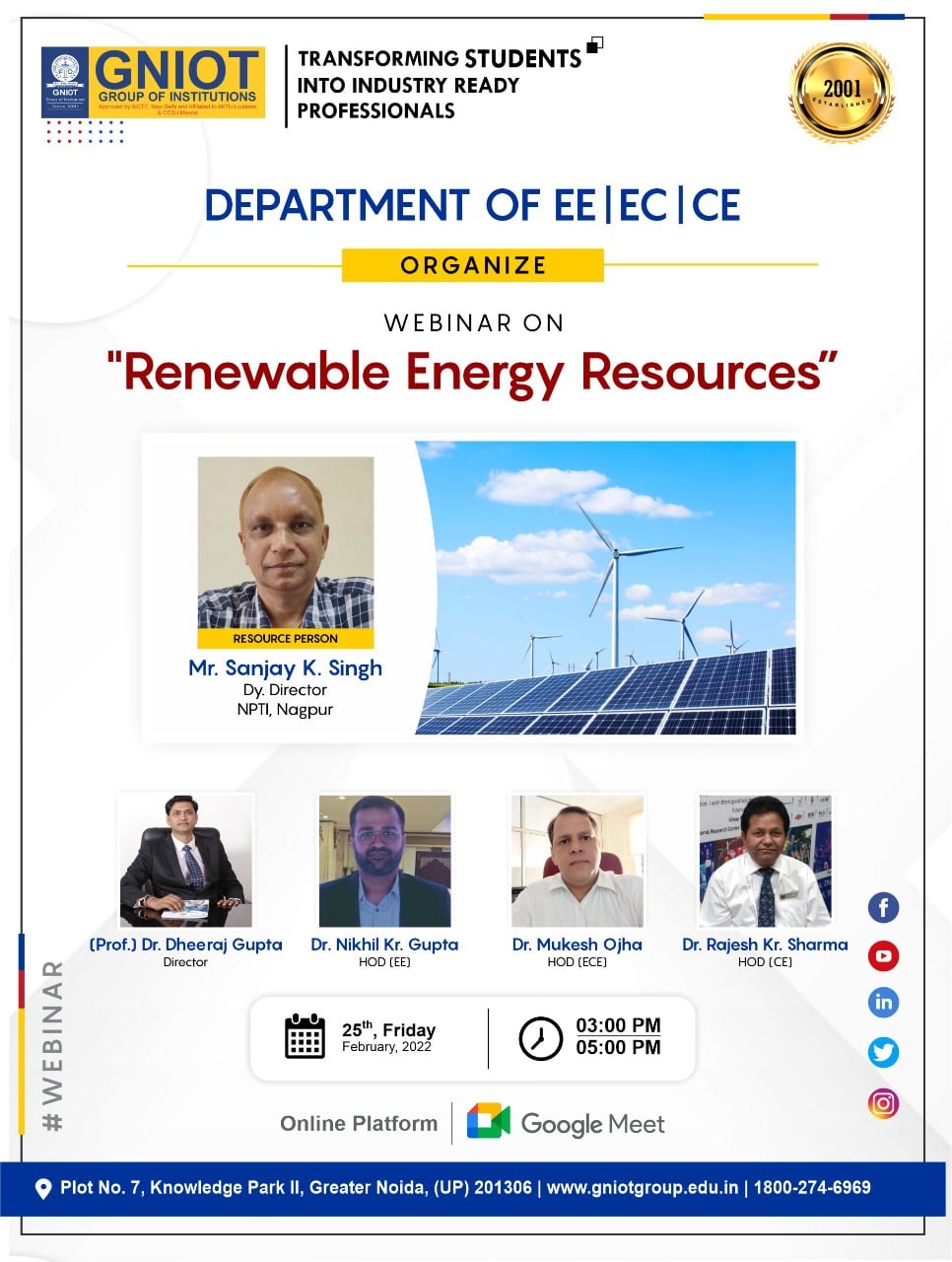 The departments of EE, ECE, and CE are in coordination organizing a webinar on Renewable Energy Sources on 25.02.2022. Guest speaker of the event will be Mr. Sanjay Kumar Singh, Dy. Director, NPTI, Nagpur. Mr. Singh has an experience of 20+ years and is an expertise in the field of renewable energy. The webinar is scheduled from 3:00 pm onwards.