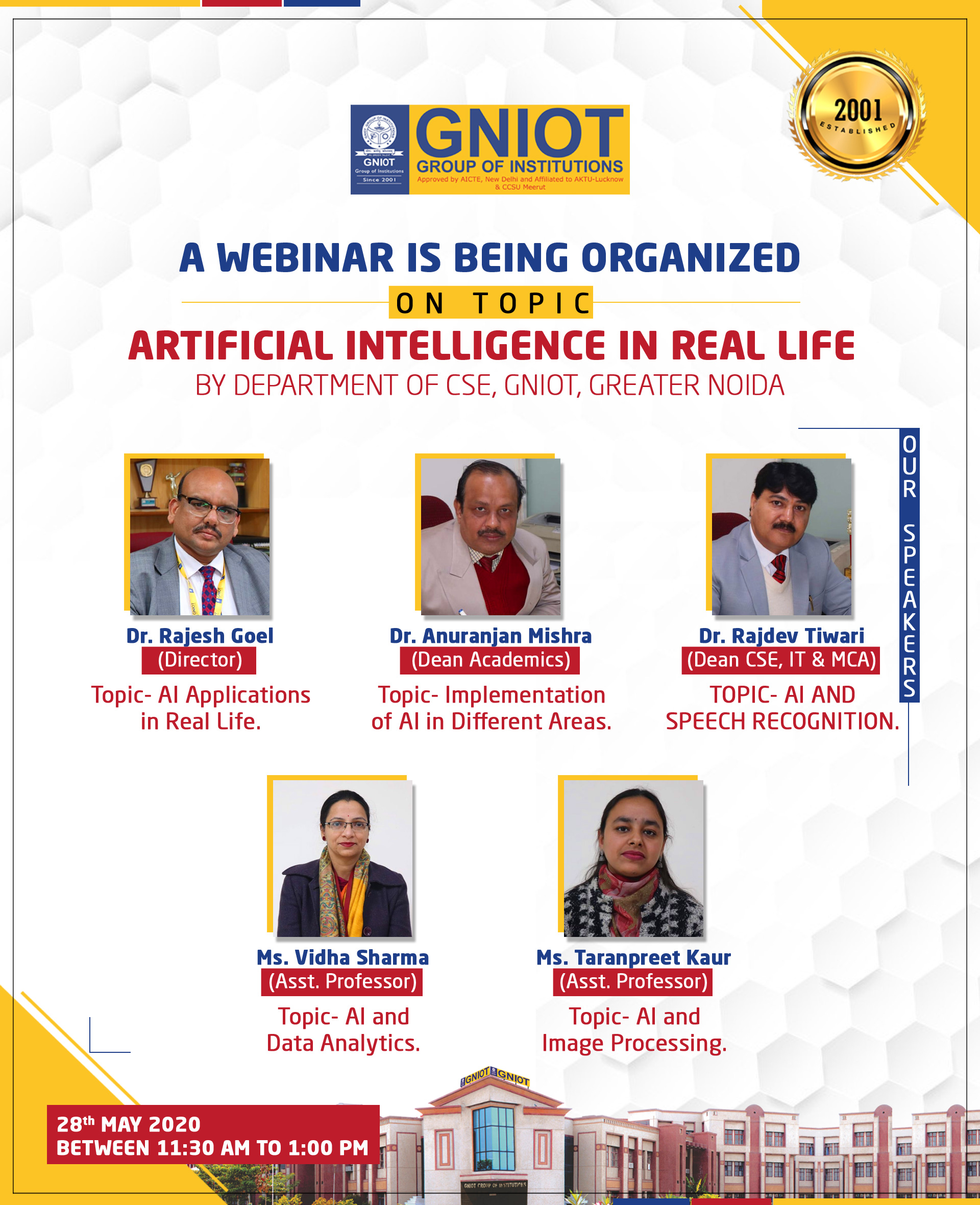 Greater Noida Institute of Technology (Engineering Institute) is going to host a webinar on Artificial Intelligence in real life in the department of Computer Science on 28th May 2020 between 11:30 am to 1:00pm . This webinar is organized to create an awareness among students and is intended to give a broad overview view of AI.