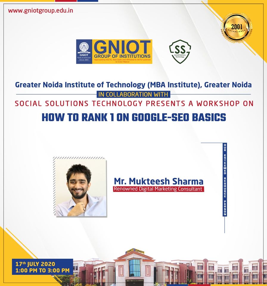 Greater Noida Institute of Technology (MBA Institute), Greater Noida in Collaboration with Social Solutions Technology is organizing a workshop on “How to rank 1 on Google-SEO Basics” on 17th July 2020 between 1:00 pm to 3:00 pm.