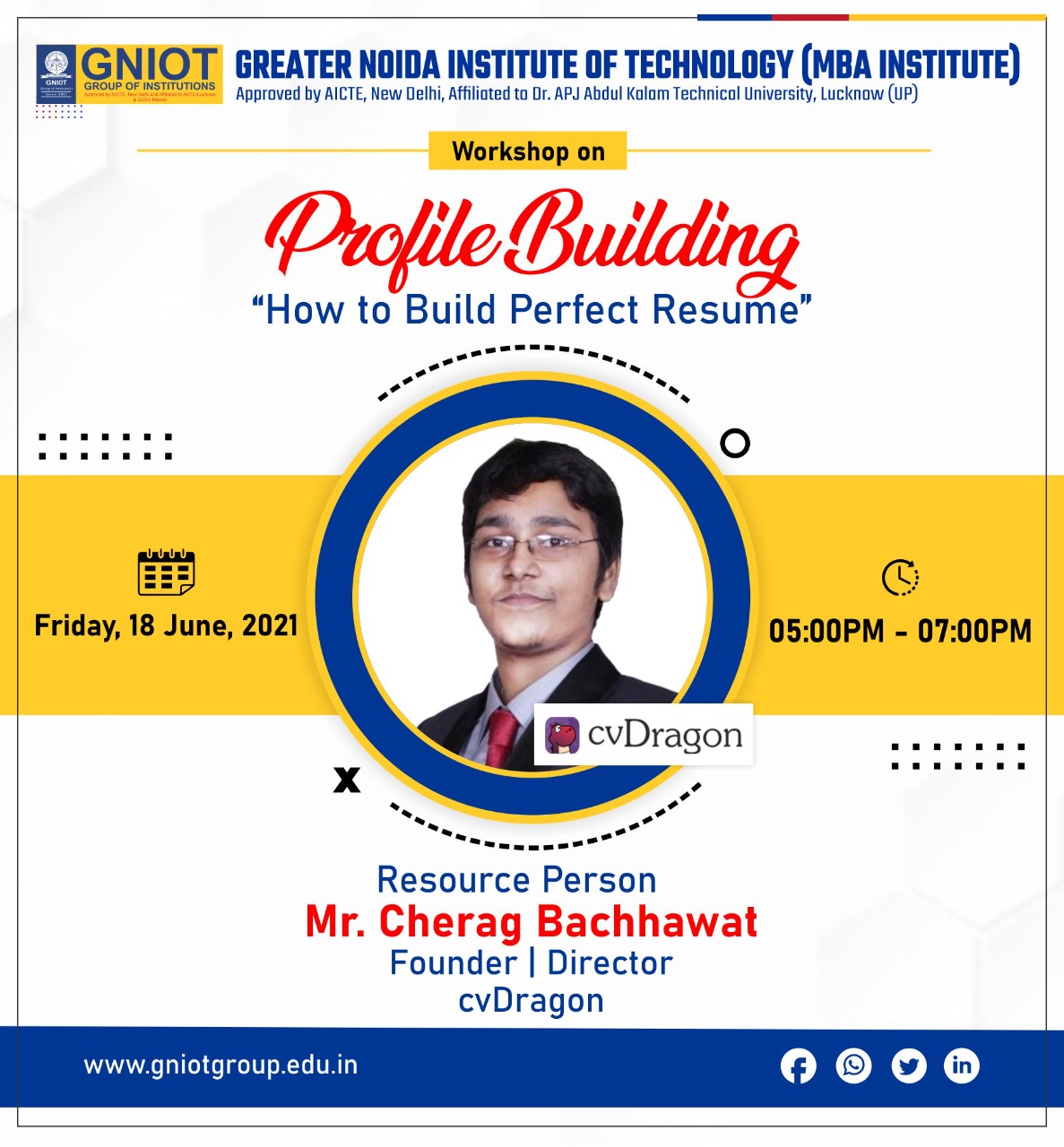 Greater Noida Institute of Technology - MBA Institute, Greater Noida in collaboration with cvDragon is organizing Profile Building Workshop on 18th June 2021 Timing 5:00 PM to 7:00 PM. The Speaker of the event is Mr. Cherag Bachhawat, Founder and Director cvDragon