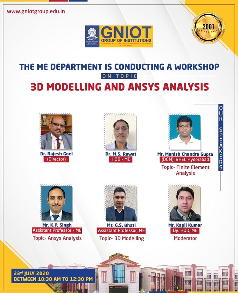 Department of Mechanical Engineering, GNIOT GROUP OF INSTITUTIONS, GREATER NOIDA, is conductiong a Workshop on “3D Modelling and Ansys Analysis” on 23rd July 2020 between 10:30 am to 12:30 pm.