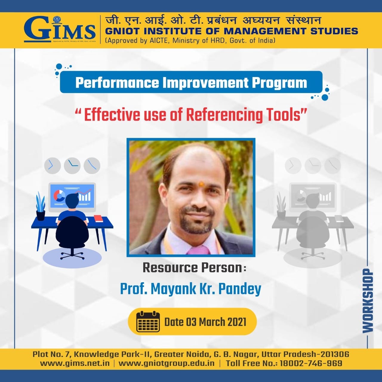 Under the banner of 'Performance Improvement Program', GNIOT Institute of Management Studies (GIMS), is organizing A Workshop on “Effective Use of Referencing Tools” for PGDM Ist year students'. The resource person is Prof. Mayank Pandey, Head-PGP & Area Chair-Marketing. The workshop is designed to help students to understand the utility of referencing tools for effective report writing.