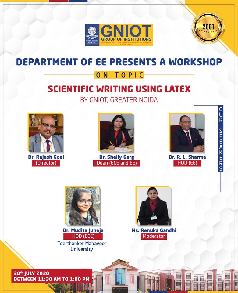 Department of Electrical Engineering, GNIOT GROUP OF INSTITUTIONS, GREATER NOIDA, is organizing a workshop on “Scientific writing using LATEX” on 30th July, 2020 between 11:30 AM to 01:00 PM.