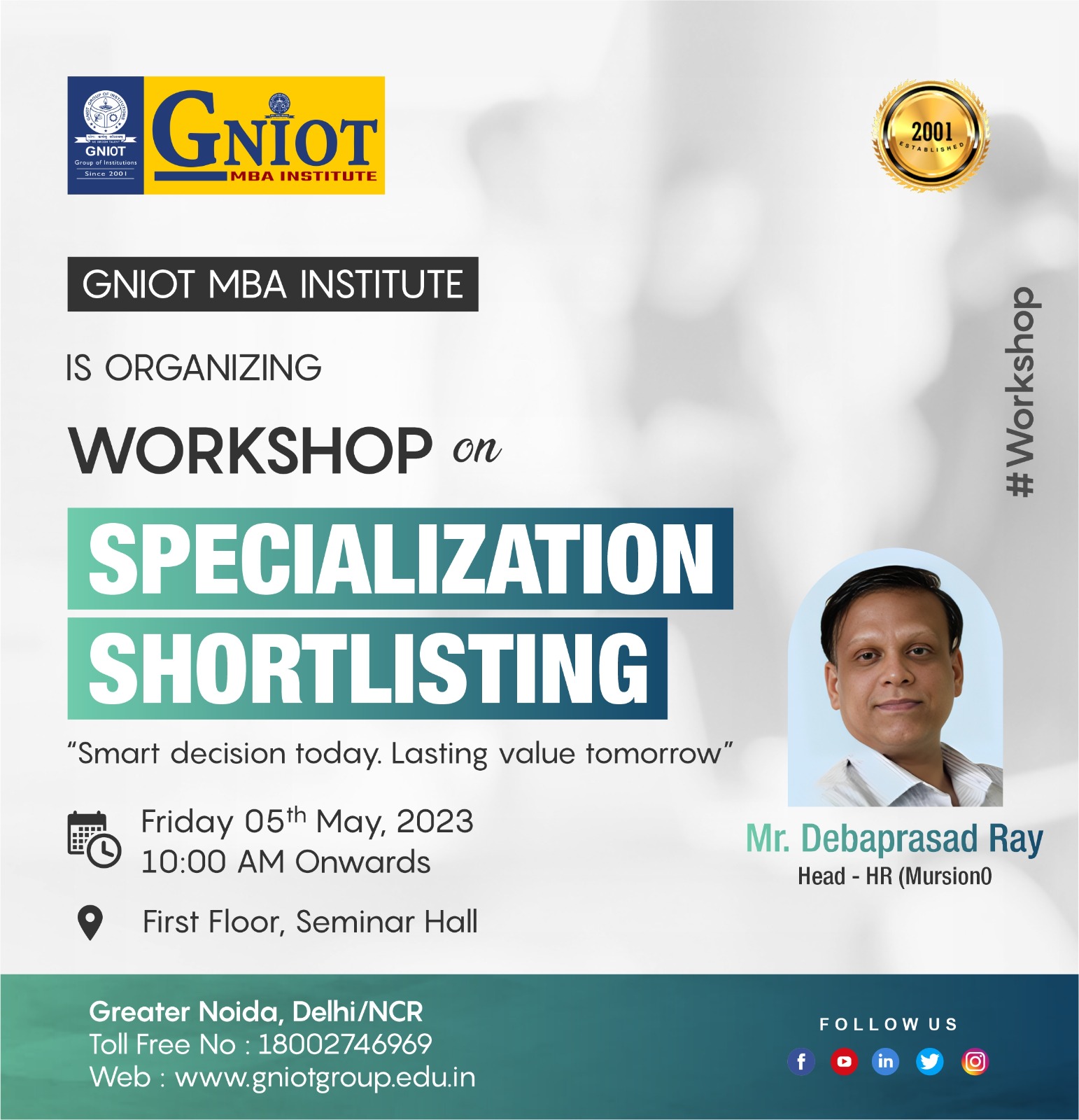 GNIOT MBA INSTITUTE is going to organise a Workshop tomorrow on skill to shortlist the Specialization. As "Smart decision today, Last value for tomorrow!".